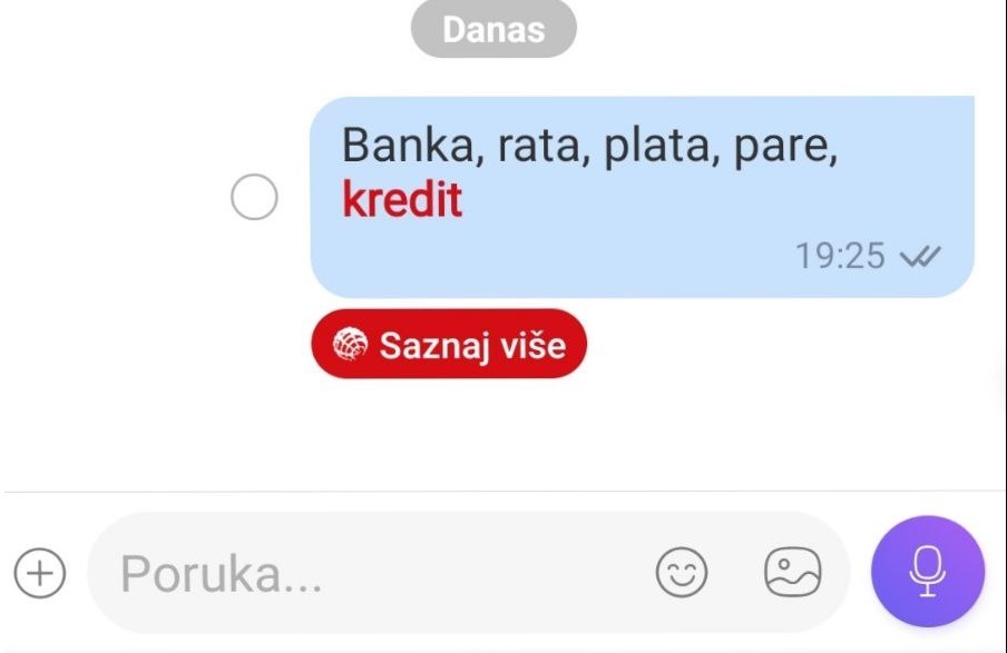Наиме, у последњих неколико дана када се у Виберу укуцају речи "банка", "паре", "рата", "плата", "кредит", те речи поцрвене, а испод њих појави се реклама Прокредит банке за узимање кредита.