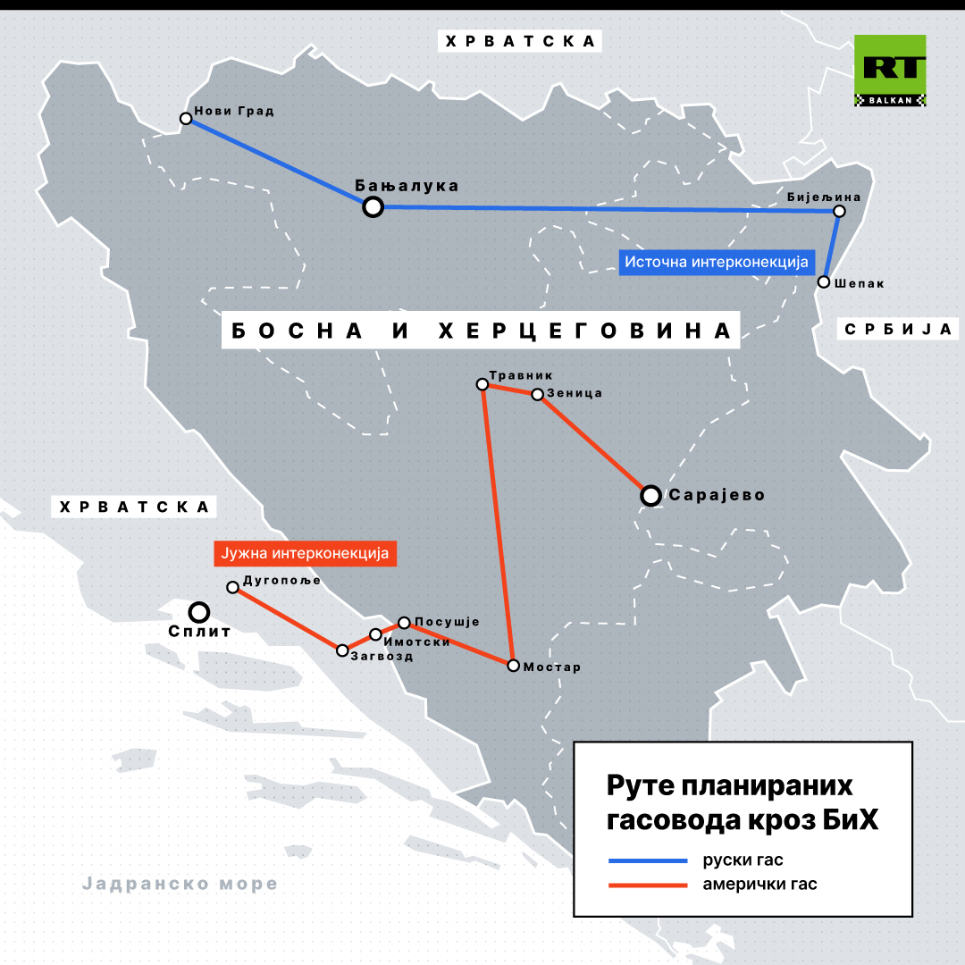 У Републици Српској и БиХ паралелно су покренуте процедуре за изградњу два велика гасовода, који долазе из потпуно различитих геополитичких праваца – један ће доводити амерички гас преко Хрватске, а други руски гас преко Србије.