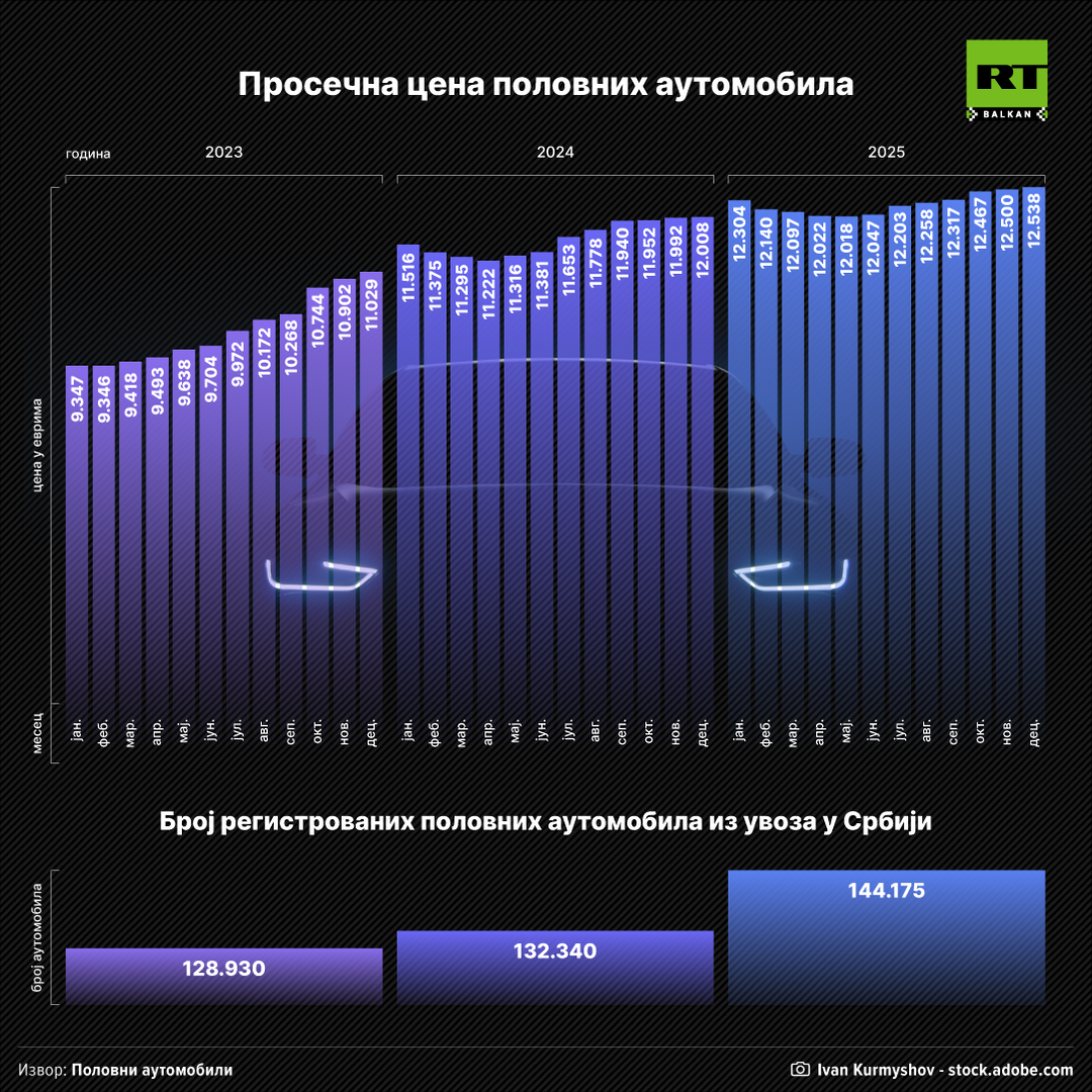 Просечан половни аутомобил из увоза данас је за више од 3.000 евра скупљи у односу на период од пре три године. Возило старо мање од 20 година је у јануару 2023. коштало 9.347 евра, а у децембру прошле године чак 12.538 евра, показују подаци портала "Половни аутомобили". Продаја половњака из увоза у Србији је прошле године порасла за готово девет одсто у односу на 2024. годину, док су просечне цене половних аутомобила биле у просеку пет одсто више него годину дана раније.