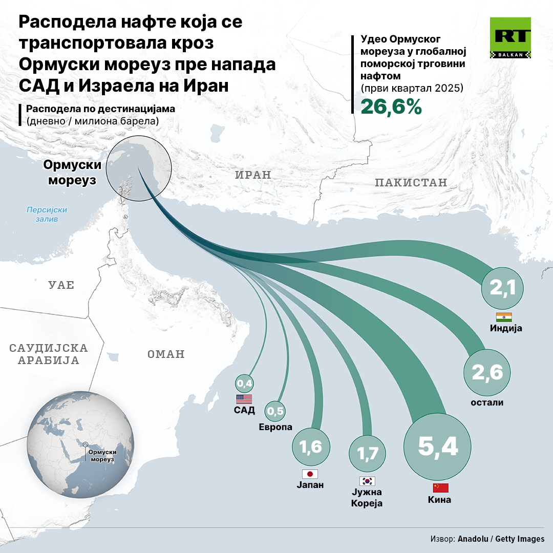 Иначе, око 26,6 одсто светске производње сирове нафте пролази кроз Ормуски мореуз, где је рат блокирао поморски саобраћај. Шок у снабдевању подигао је цену нафте, уздрмао финансијска тржишта, повећао цене горива и појачао страх од већег економског удара.