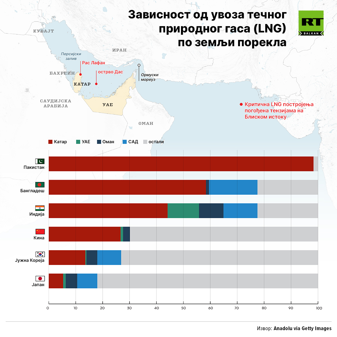 Главне азијске економије, укључујући Јапан, Јужну Кореју, Индију и Кину, такође су значајно зависне од дугорочног снабдевања из Катара. Ове сметње су већ изазвале борбу купаца за неуговорене количине, а већа потражња утицала је на раст цена.