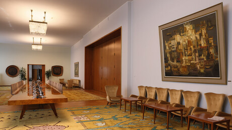 У Српском салону смо затекли огромни дрвени сто "високог сјаја" на ком се налазе микрофони предвиђени за сатанке различитих формата, што му је данашња намена. Ипак, тако није било за време Јосипа Броза Тита: