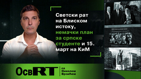 Како је америчко-израелски напад на Иран прерастао у светски рат на Блиском истоку, како се то одражава на енергетску безбедност Србије, шта је немачки план за српске студенте и шта смо све урадили — а шта нисмо — уочи 15. марта на Косову и Метохији, неке су од тема које је ове недеље у својој ауторској емисији "ОсвРТ" анализирао уредник информативног програма телевизије РТ Балкан Никола Врзић.