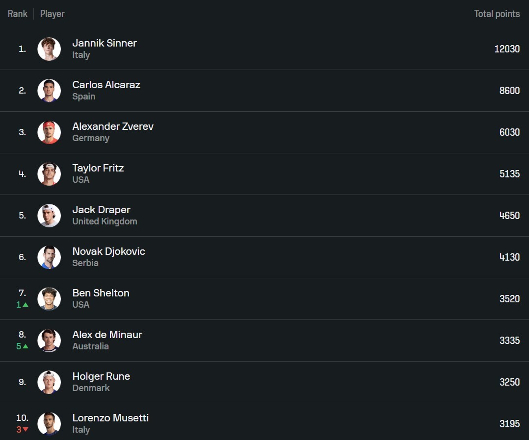 Шпанац Карлос Алкараз је други тенисер света са 8.600 поена, док се Немац Александар Зверев налази на трећој позицији са 6.030 бодова.