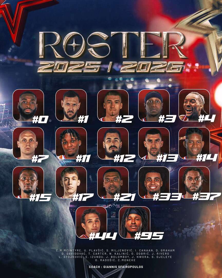 За Црвену звезду ће у наредној сезони играти: Коди Милер Мекинтајер, Урош Плавшић, Стефан Миљеновић, Ајзеа Кенан, Девонте Грејем, Дејан Давидовац, Тајсон Картер, Никола Калинић, Огњен Добрић, Хасиел Риверо, Ебука Изунду, Лазар Стојковић, Џоел Боломбој, Џордан Нвора, Семи Оџелеј, Огњен Радошић и Чима Монеке.