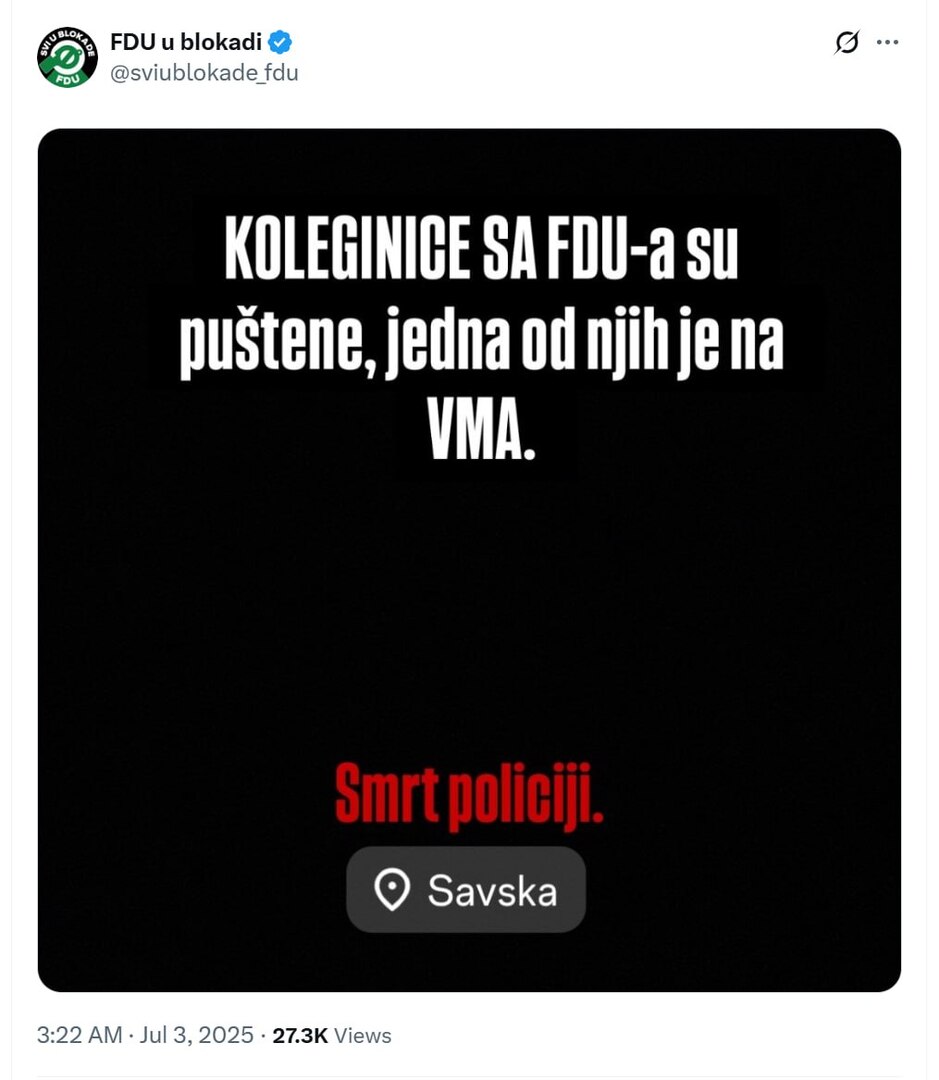 У датој објави наводи се: "Колегинице са ФДУ су пуштене, једна од њих је на ВМА", а у наставку поруке поручује се "Смрт полицији", уз ознаку локације у Савској улици, где се налази ПС Савски венац.