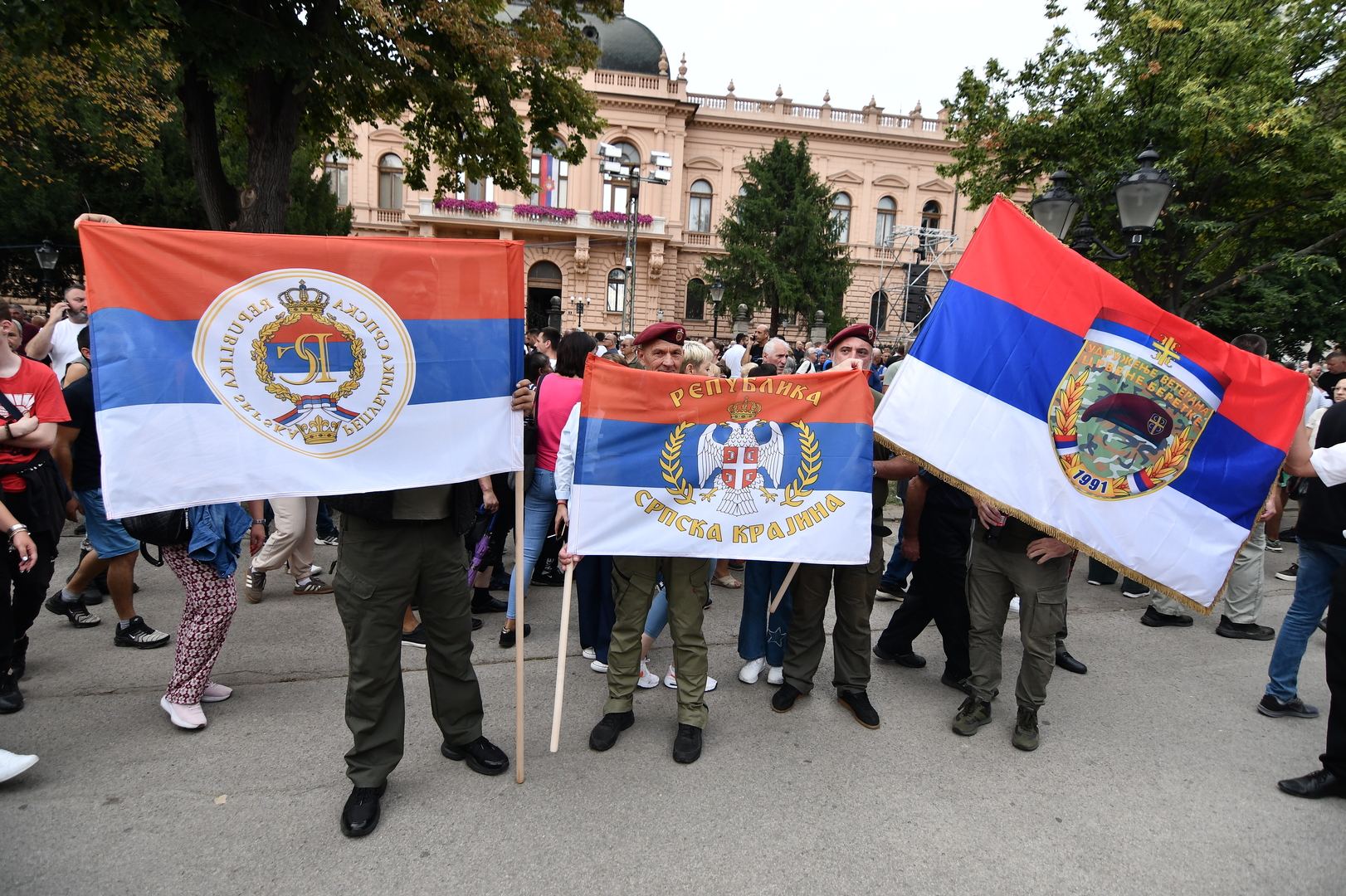 Велики број грађана стигао је у Сремске Карловце носећи заставе Србије, а на челу колоне је био транспарент "Олуја је геноцид".