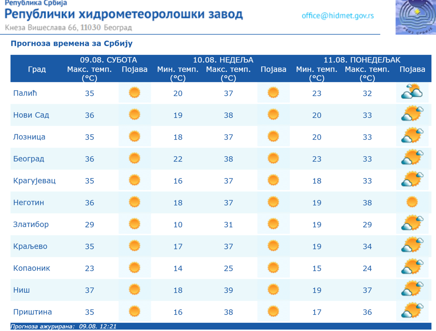 За викенд и током наредне седмице очекује се веома топло време са максималним температурама од 35 до 38 степени Целзијусових, а само ће у понедељак и уторак (11-12.08.) температуре бити нешто ниже око 33 степена, наводе из РХМЗ-а.