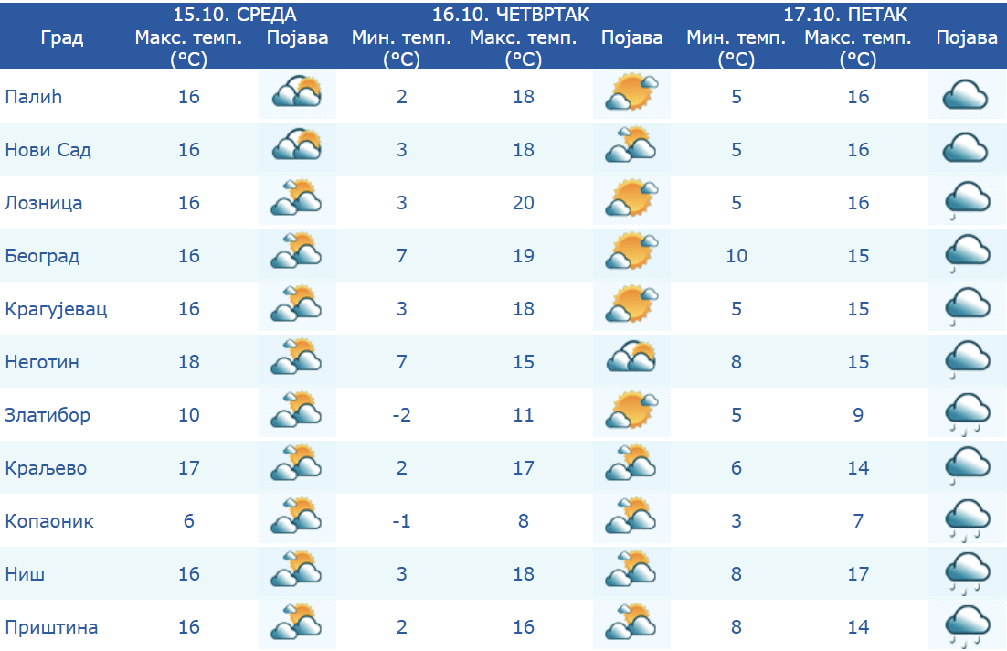 У среду после подне и увече на северу и западу, а у току ноћи и у четвртак и у осталим крајевима очекује се наоблачење, понегде са кишом.