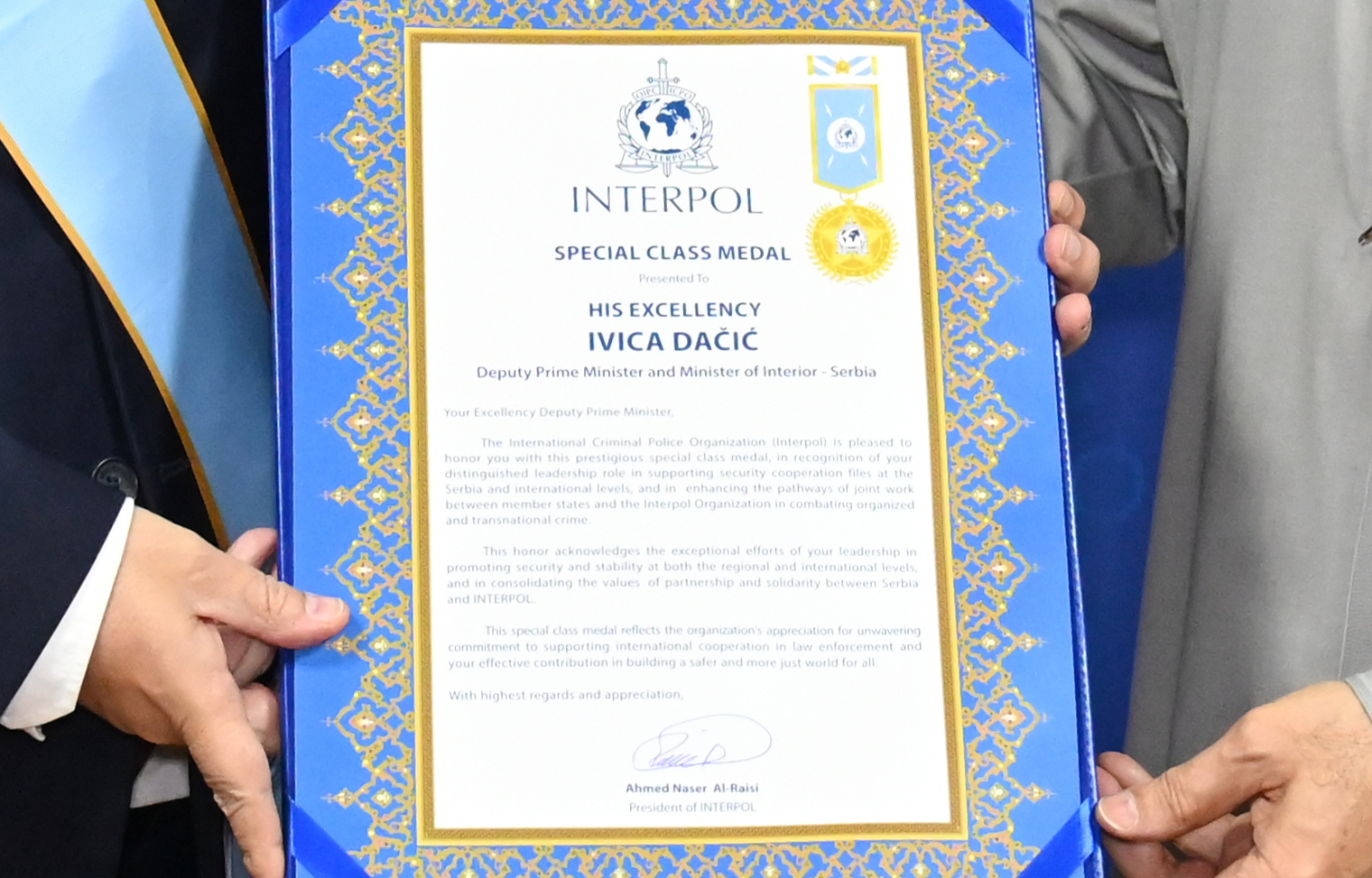 "Медаља посебног ранга представља израз искрене захвалности ове организације за Вашу непоколебљиву посвећеност унапређењу међународне сарадње у области спровођења закона и за Ваш делотворан допринос изградњи безбеднијег и праведнијег света за све", наводи се у престижном признању Интерпола које је министру Дачићу уручио председник Интерпола Ахмед Насер Ал-Раиси.