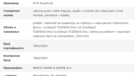 Од малих богиња, заушака и рубеле децу штити ММР вакцина. И она стиже из увоза из Холандије, а произвођач је фармацеутска компанија Мерк. Сертификат су добили од Агенције за лекове и медицинска средства 27.8. 2024. године.