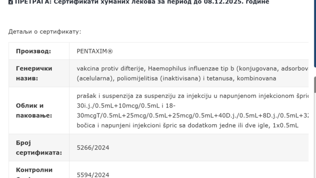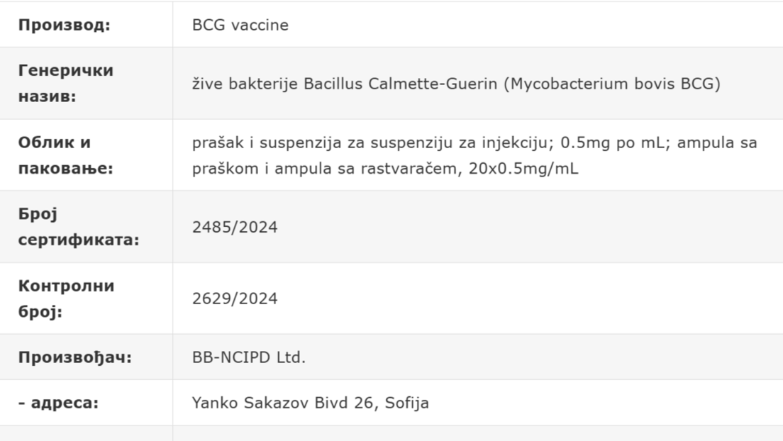 Претраживањем сајта Агенције за лекове и медицинска средства (АЛИМС) може се видети да одобрен сертификат за Србију има вакцина коју производи ББ-НЦИПД из Софије (Бугарска).