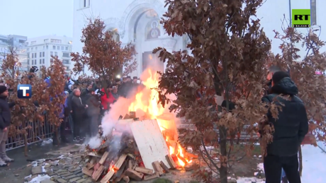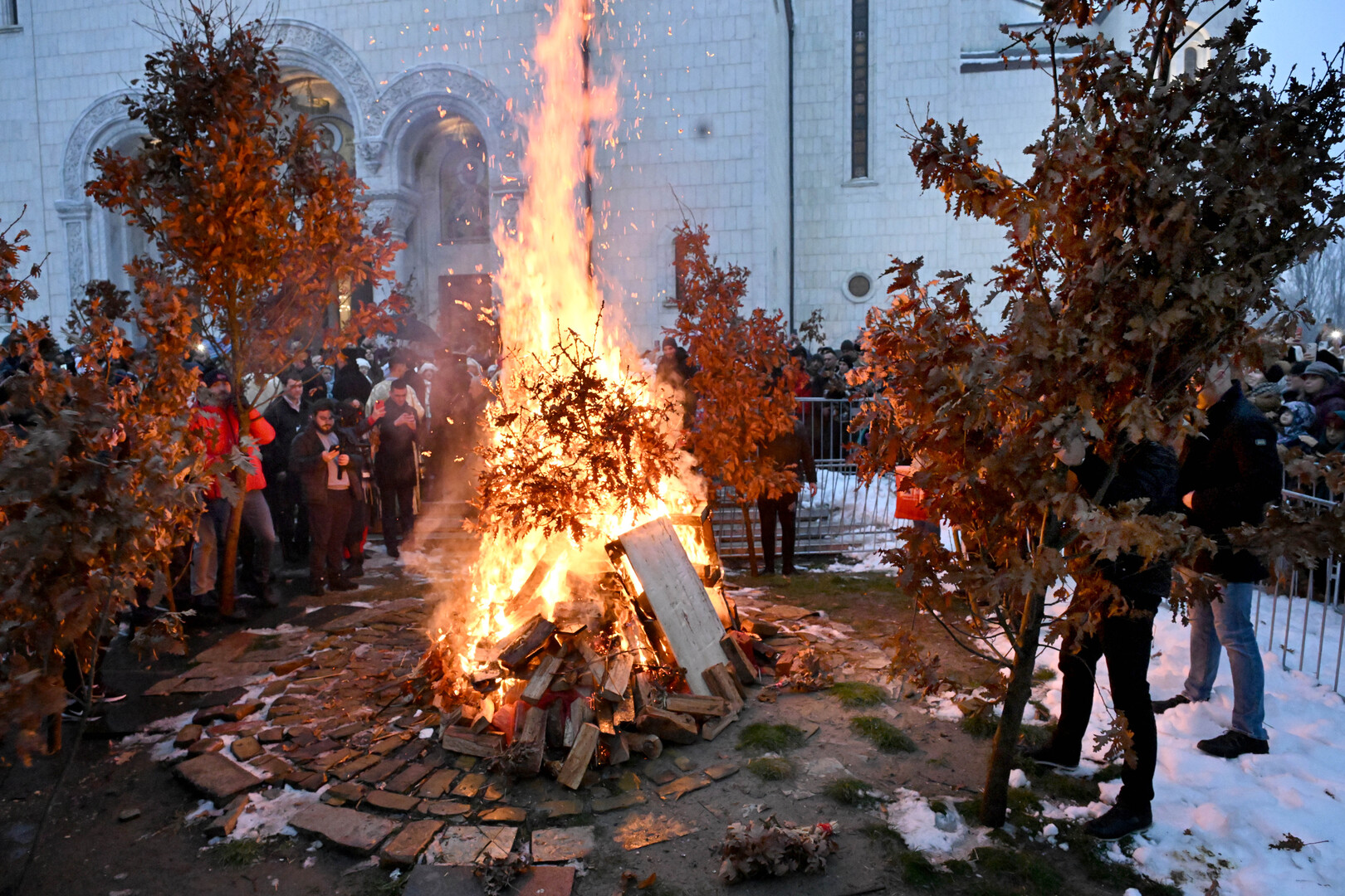 Испред Храма Светог Саве у Београду на Бадње вече традиционално је запаљен бадњак у присуству великог броја верника.