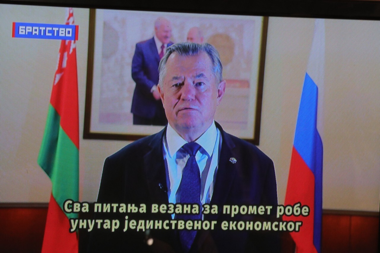 "Наша Савезна држава се успешно развија – недавно смо прославили 25. годишњицу њеног оснивања – и отворени смо за сарадњу са свим пријатељским земљама. Позивамо братску Србију на заједнички рад", изјавио је на почетку скупа у видео-обраћању Сергеј Глазјев, државни секретар Савезне државе Русије и Белорусије.