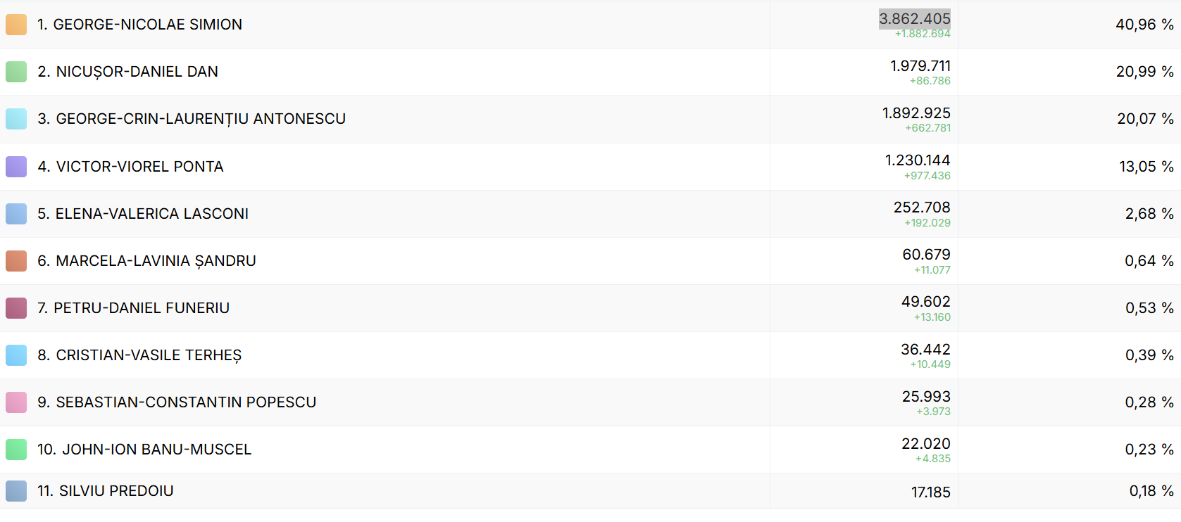 Први резултати у недељу после 22 сата су избацили Симиона на прво место, а следио га је Крин Антонеску, Виктор Понта, Никушор Дан и Елена Ласкони. Након пребројавања гласова, преносе румунски медији, са 34 одсто пребројаних изборних јединица, градоначелник Букурешта се попео на треће место. Следећа промена у рангирању догодила се после поноћи када је Дан прешао на друго место, претекавши Антонескуа.