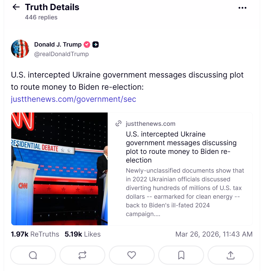 "Украјинска влада и неименовани амерички званичници, преко УСАИД-а у Кијеву, наводно су осмислили план којим би стотине милиона долара америчких пореских обвезника, предвиђених за изградњу украјинске инфраструктуре, били преусмерени за финансирање демократске странке и кампање реизбора Џоа Бајдена", каже се у делу извештаја који није означен строго поверљиво.